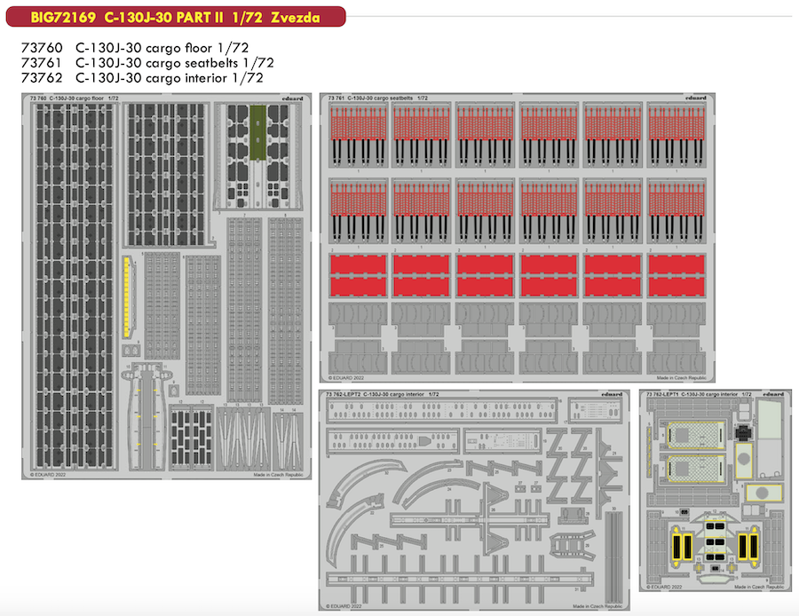 All products are in stock. Lockheed C-130J-30 Hercules PART II 1/72 (designed be used with Zvezda kits) This BiG-Ed set includes all these Eduard sets….. (First delivered late March 2022) ED73760 C-130J-30 cargo floor ED73761 C-130J-30 cargo seatbelts ED73762 C-130J-30 cargo interior
