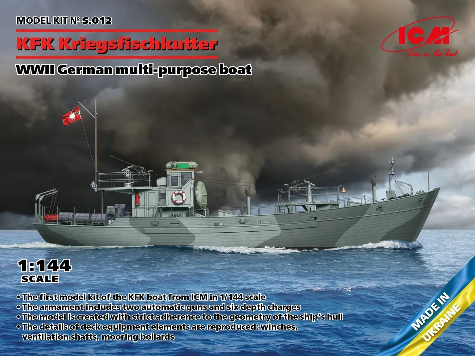 Universal boats of the KFK (Kriegsfischkutter) type were developed in late 1941 on the basis of a fishing seiner. They were built by various companies in Germany and other countries (including neutral Sweden). After a small reequipping, they could be used as trawlers (they could carry contact, magnetic, and acoustic trawls), submarine hunters (a hydroacoustic station was installed on the boats), or patrol boats. The boats’ hulls were made of wood, but some shipyards made them of metal or composite according to their technological requirements.