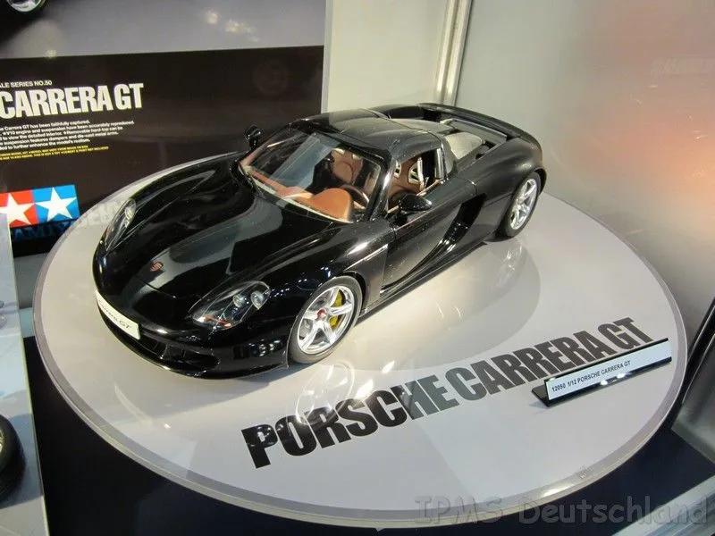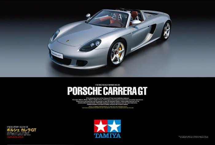 This is a 1/12 scale premium assembly model kit of the Porsche Carrera GT. Assembly of the delicately curved body follows that of the full-size car. Durable die-cast suspension arms are combined with working dampers and stabilizers for real-action suspension. Metal-hinged doors, hood and rear cowl open realistically to display the fully detailed interior and V10 engine. The rear wing pops up to the extended position when the license plate is pressed, while the hard-top can be removed and stored under the hood to show off the convertible style of the Porsche.